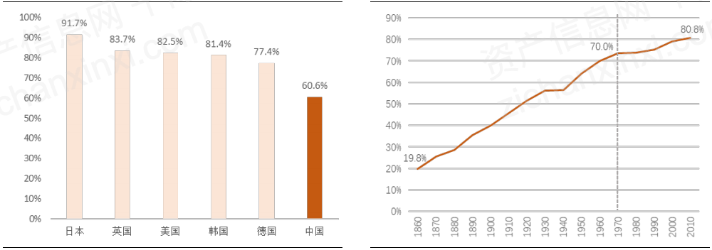 图 主流国家城镇化率对比及美国城镇化率历史变化