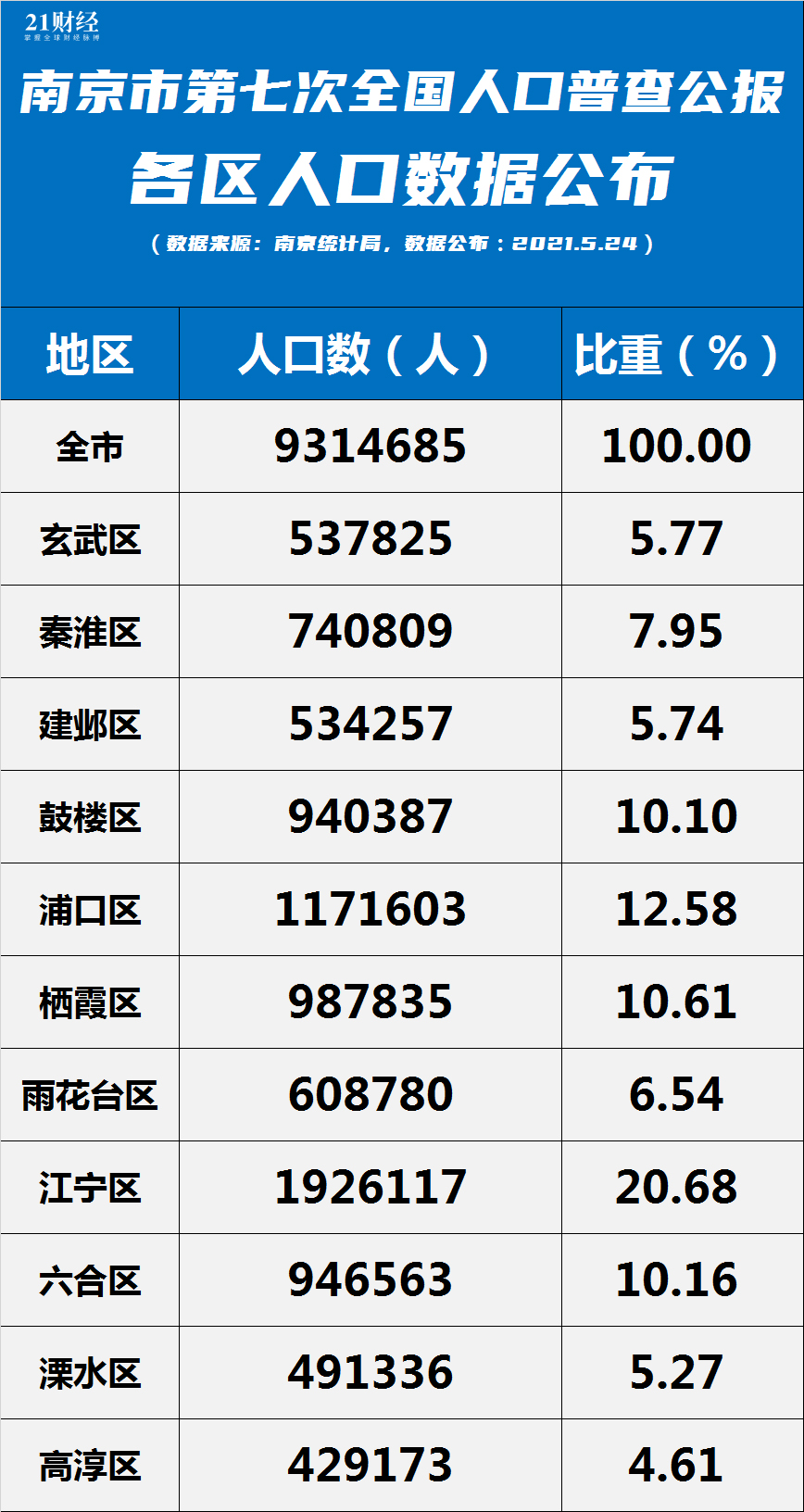 南京各区人口数据出炉。