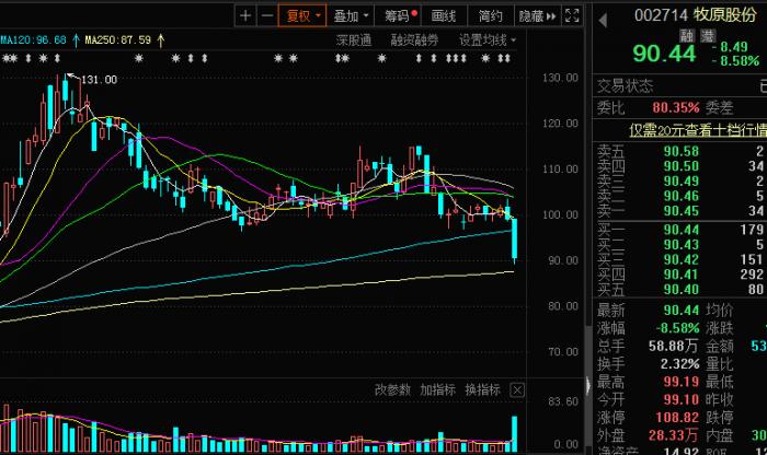 早盘10点36分,开盘后就一路下行的002714牧原股份触及了跌停板,虽然随后一直在跌停板上“摩擦”,但最终还是无力翻身,以暴跌8.58%收盘。单日成交量也急剧放大至54亿元,有资金恐慌出逃。