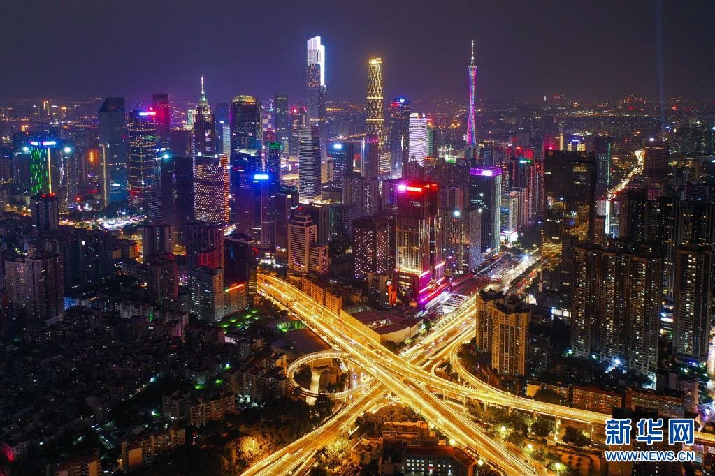 广州珠江新城城市新中轴线夜景(2020年10月2日摄,无人机照片)。新华社记者 刘大伟 摄