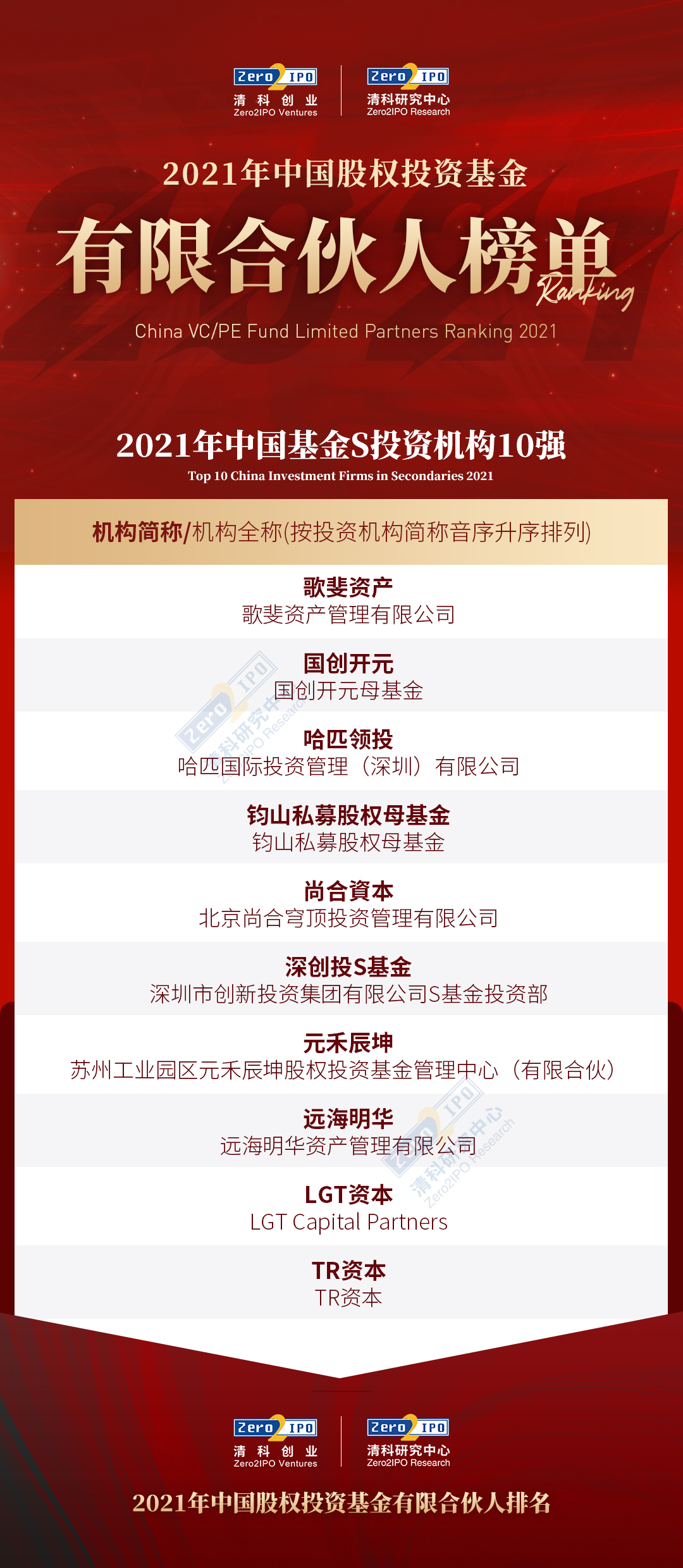 此背景下,清科研究中心基于私募通庞大的数据支持,综合考量股权投资基金有限合伙人的募资、投资、退出情况,设计科学的评选标准体系,从上千家有限合伙机构中评选出「2021年中国股权投资市场机构有限合伙人30强」、「2021年中国政府引导基金50强」两大主榜单,「2021年中国基金S投资机构10强」及2021年中国机构有限合伙人和政府引导基金市场最具影响力投资人榜单。
