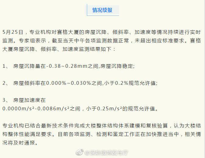 5月25日,专业机构对赛格大厦的房屋沉降、倾斜率、加速度等情况持续进行实时监测。专家组表示,截至当天中午各项监测数据正常,未超出相应标准要求。赛格大厦房屋沉降、倾斜率、加速度监测结果如下: