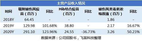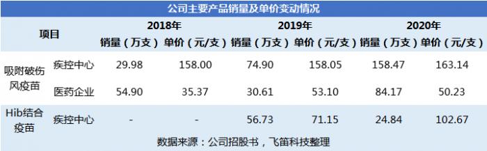 从各类产品详细的收入数据来看,吸附破伤风疫苗及破伤风类毒素浓缩原液产品收入在报告期内持续增长。其中作为公司主要收入来源的吸附破伤风疫苗产品收入从2018年的6445万元增长至2020年的2.91亿元,在报告期内的增速均大于100%。而Hib结合疫苗产品的收入在2020年相较2019年有所下滑。