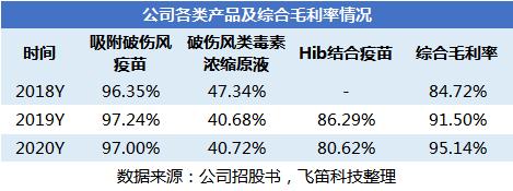 在报告期内,公司的综合毛利率分别为84.72%、91.50%、95.14%。从数据来看,公司的综合毛利率处于较高的水平,并持续提升。公司称主要是由于公司毛利率产品较高的吸附破伤风疫苗产品收入占比增加导致的。