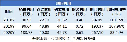 在如此高的毛利率水平下,公司2018年及2019年仍处于亏损状态,到2020年虽扭亏为盈,但利润率也只有8.5%,公司的盈利能力为何不理想?我们来看看公司的期间费用情况。