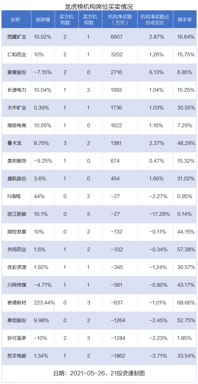 其中,机构净买入金额最多的是西藏矿业(000762.SZ),当日收盘上涨10.02%,换手率为16.64%。