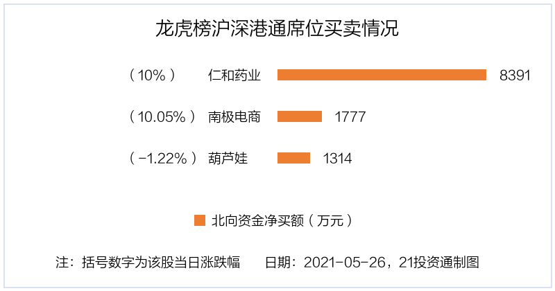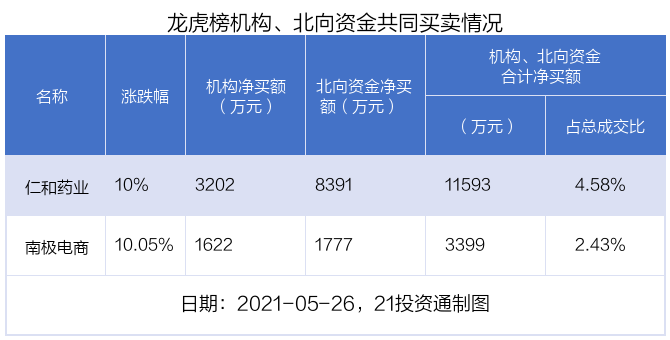 值得注意的是,机构和北向资金共同净买入了仁和药业、南极电商等2股。