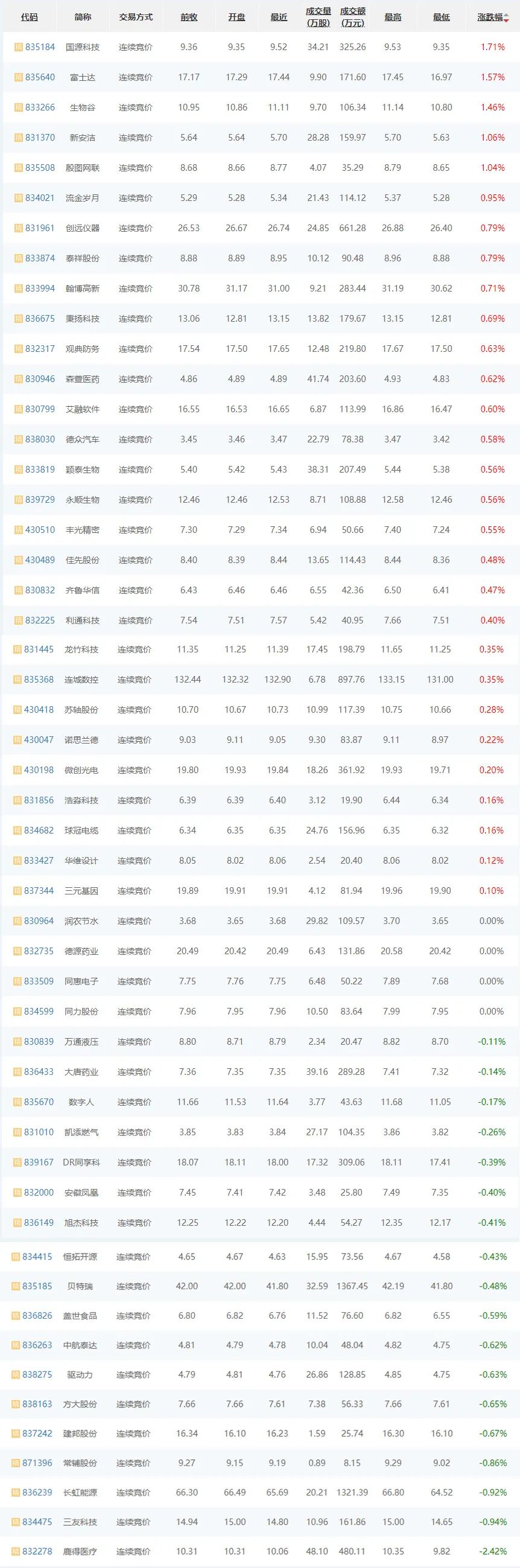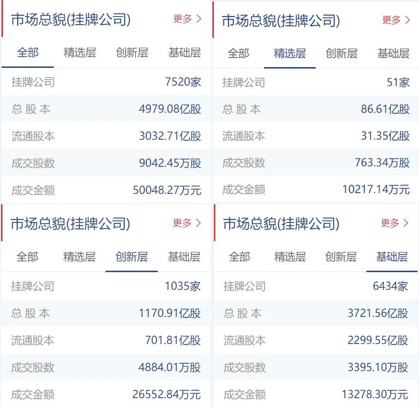 截至5月26日收盘,今日成交金额为5.00亿元,精选层成交金额为1.02亿元,创新层成交金额为2.66亿元,基础层成交金额为1.33亿元;今日成交股数为9042.45万股,精选层成交股数为763.34万股,创新层成交股数为4884.01万股,基础层成交股数为3395.10万股。