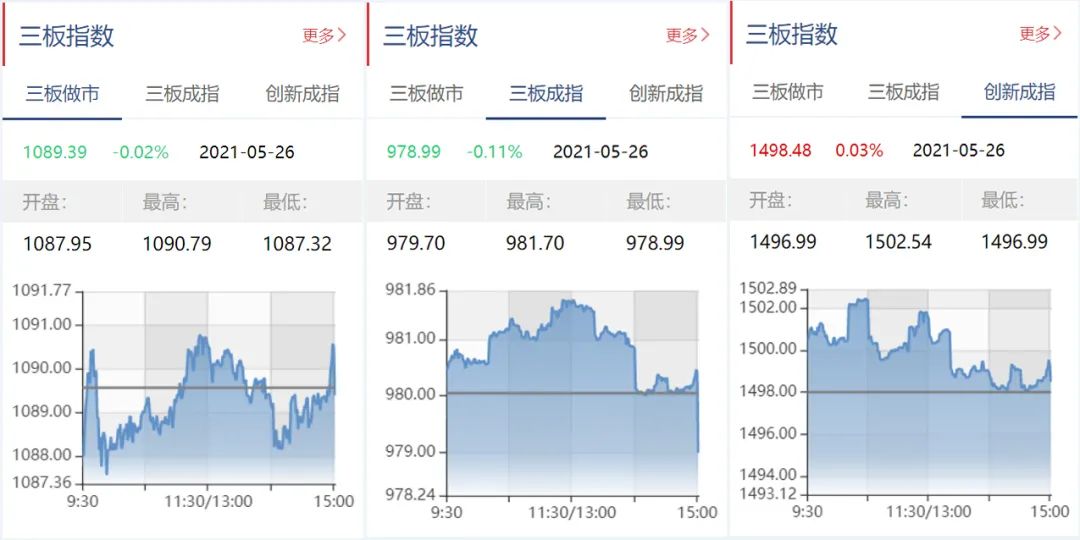 截至5月26日收盘,三板做市报1089.39点,下跌0.02%;三板成指报978.99点,下跌0.11%;三板创新报1498.48点,上涨0.03%。