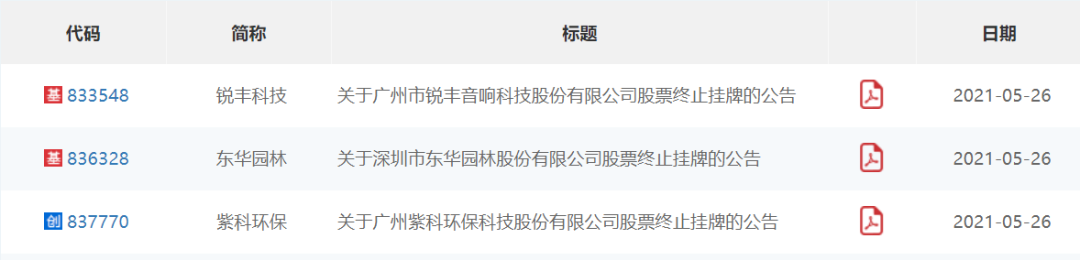 5月26日,全国股转公司公告,新三板创新层公司紫科环保及基础层公司锐丰科技、东华园林终止挂牌。