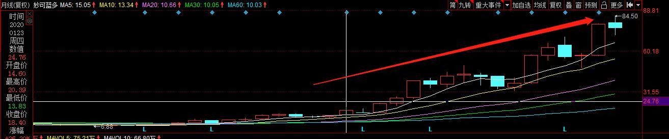 值得一提,从去年年初到今年5月份,妙可蓝多股价涨幅偏高,成为一只大牛股。行情显示,这家公司从去年年初的13.83元一路上涨,于今年5月份涨到84.5元,股价涨幅超过500%。