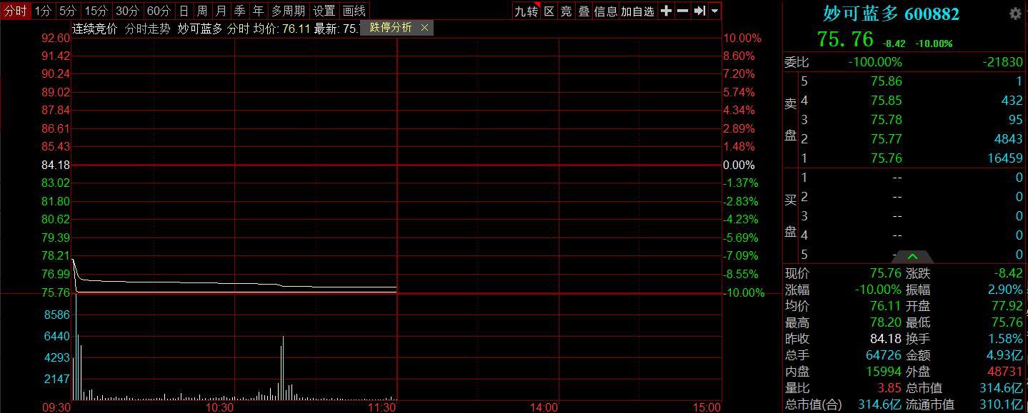 截至午盘收盘,妙可蓝多依然跌停且有超过万手封单。