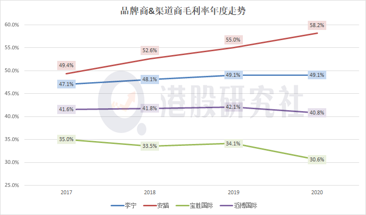 中间渠道商的低毛利率并不是个例,同样卖国际鞋服品牌的宝胜国际在2020年的毛利率也只有30.6%。