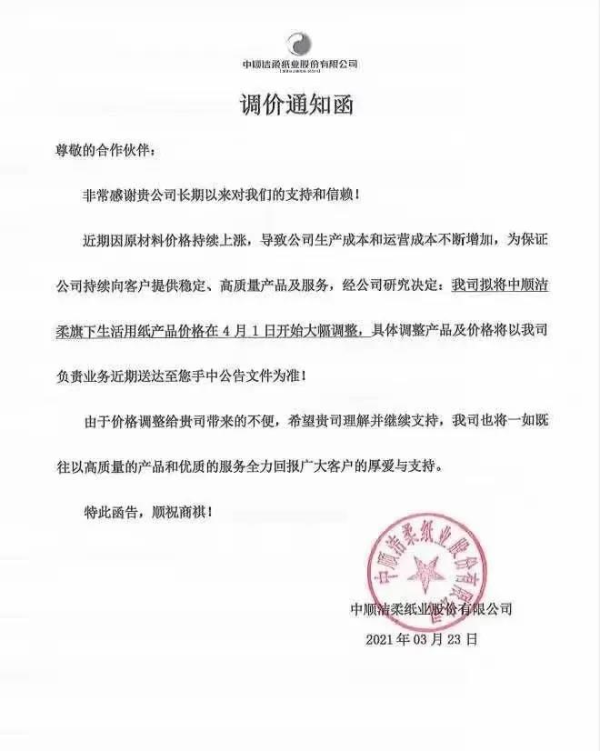 在这样的背景下,含有纸业的公司股票纷纷大涨,慢慢地产品价格也进行了调整。在4月,中顺洁柔、维达、清风等纸业龙头都纷纷就调整了生活用纸的价格,提供给经销商的价格上调了10%到20%左右,但很多下游的公司却不敢轻易调价。