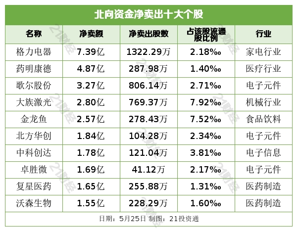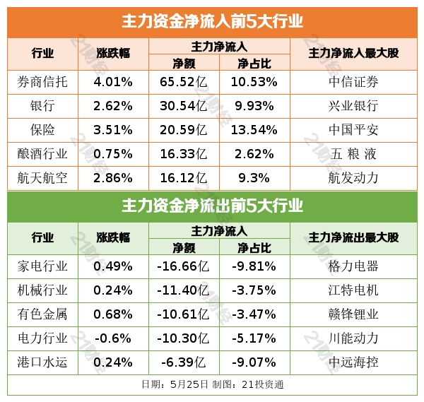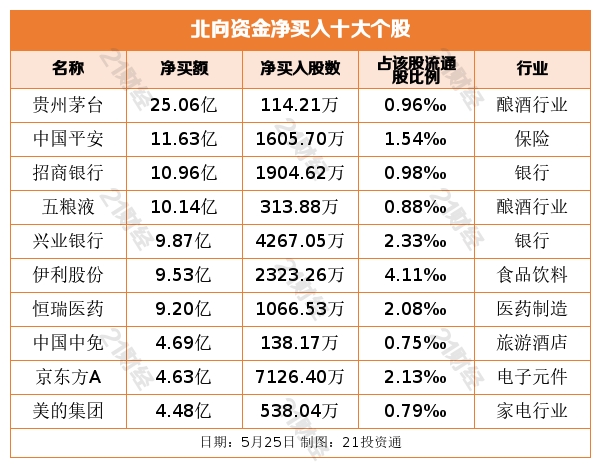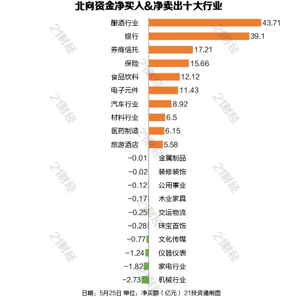 据21投资通(微信号ID:touzit21)智能监测,5月25日,北向资金净买入217.23亿元,其中沪股通净买入168.12亿元,深股通净买入49.12亿元。增持酿酒行业,减持机械行业。