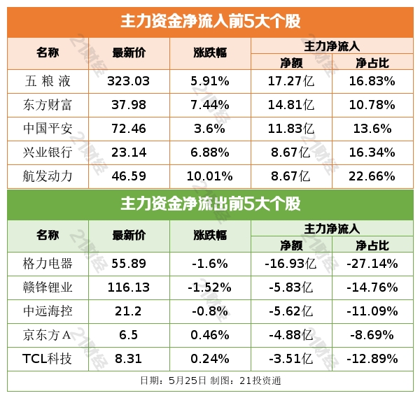 个股方面,北向资金净买入贵州茅台(600519.SH)、中国平安(601318.SH)、招商银行(600036.SH)、五粮液(000858.SZ)、兴业银行(601166.SH)居前;净卖出格力电器(000651.SZ)、药明康德(603259.SH)、歌尔股份(002241.SZ)、大族激光(002008.SZ)、金龙鱼(300999.SZ)居前。