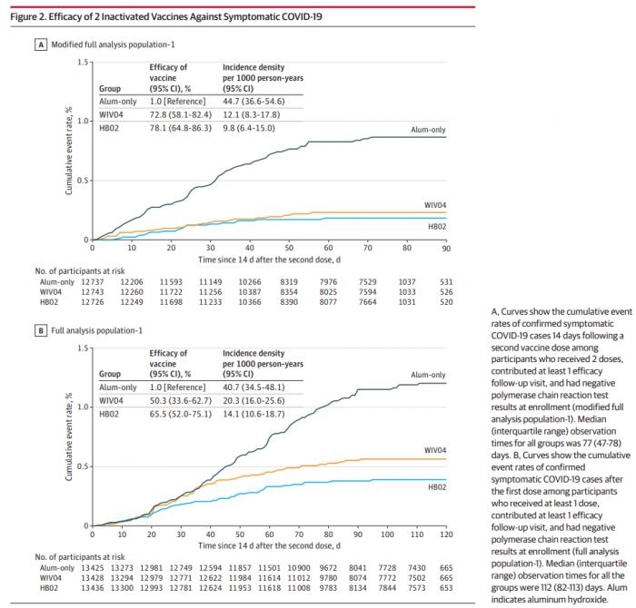自2020年7月16日起,40411名受试者入组并随机分为三组,分别为铝佐剂组、新冠疫苗WIV04组和新冠疫苗HB02组。受试者在第0天和第21天接受两次肌肉注射。自第二剂接种后14天,累计确诊142例有效病例(铝佐剂组95例,WIV04组26例,HB02组21例),两种疫苗组有效率分别为72.8%和78.1%(均P<.001)。铝佐剂组出现2例重症病例,两个疫苗组均未出现重症病例。