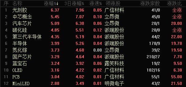 这其中值得一提的是科技板块。之前科技板块已经调整了超过半年的时间。不过事情总是有改变的。今天科技板块的各细分行业,比如光刻胶、汽车芯片、半导体、PCB灯等霸占了涨幅榜的前列。