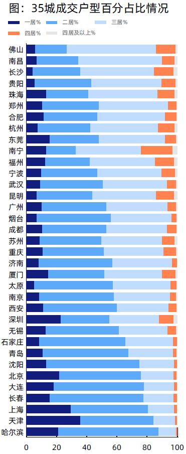 报告研究发现,35个城市中,两居室成为主力交易户型。以北京、上海为代表的一线城市,两居室成交占比较高。三居室成交户型百分占比紧随其后,佛山、南昌及长沙等城市的三居室户型占比较高,除了受供给侧影响外,这几个城市的购房压力相对较低。