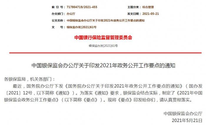 5月27日,银保监会发布《2021年中国银保监会政务公开工作要点》,包括加强重大政策发布和解读回应、完善政务信息管理和公开平台建设、深化政府信息公开条例的贯彻落实、强化公开工作组织保障四个方面。其中,银保监会提出,要加强反垄断与反不正当竞争执法信息公开工作。