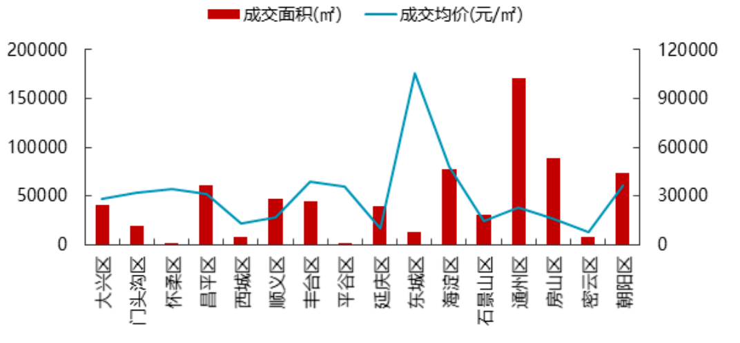 具体来看,通州、房山、海淀、朝阳区成交面积占比分别为23.6%、12.3%、10.7%和10.3%。从成交面积段来看,2000㎡以上面积段成交面积占比最高,达到35.5%,其次为200㎡以下面积段,占比为27.5%(数据来源:中指研究院)。