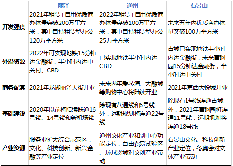 从五个关键维度考量北京各新兴办公区域的选址价值和优势,并且预判未来十年的发展空间,可见丽泽、通州、石景山将相继进入快速发展期,在未来不同时期为租户和投资者提供优质选择,为市场长期可持续和多元的发展奠定基础。