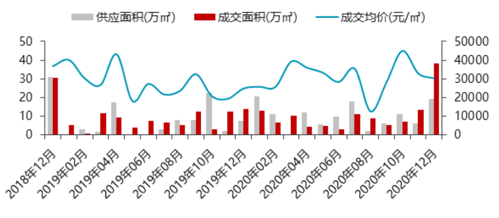 商业地产方面,2020年北京商业供应26.89万㎡,同比下降26.4%;成交面积72.19万㎡,同比增长26.2%;成交均价28216元/㎡,同比下跌13.3%。从成交区域来看,通州、房山、海淀、朝阳区成交面积较大,占比约为北京市总成交57%(数据来源:克而瑞)。