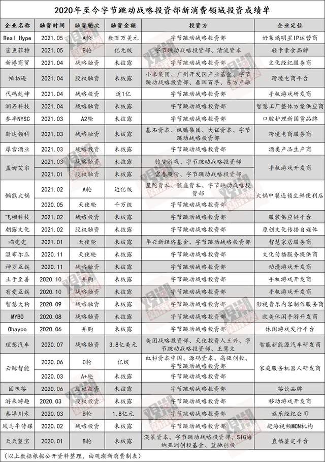2021年,字节跳动投出参半NYSC、Starlink斯达领科、懒熊火锅、厚雪酒业、鲨鱼菲特、新港商贸等新消费类项目。从口腔护理品牌、跨境电商平台、连锁火锅超市到新式茶饮、健康素食、直播经纪机构,还有正流行的低卡气泡酒。