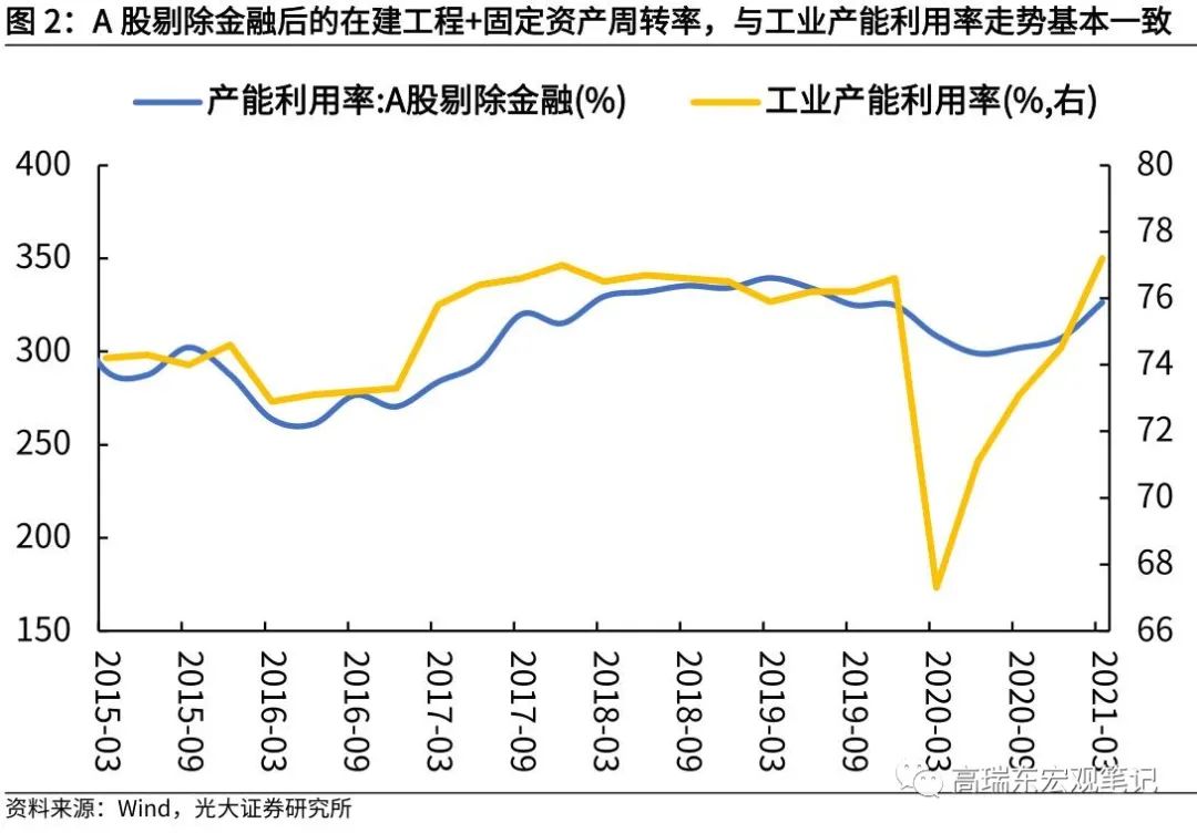 一方面,从概念上来看,在建工程+固定资产周转率反映了企业资产的营运能力,是衡量企业资产管理效率的重要财务比率,因而更符合“产能”的定义;另一方面,A股剔除金融后的在建工程+固定资产周转率,与国家统计局公布的工业产能利用率走势基本一致。