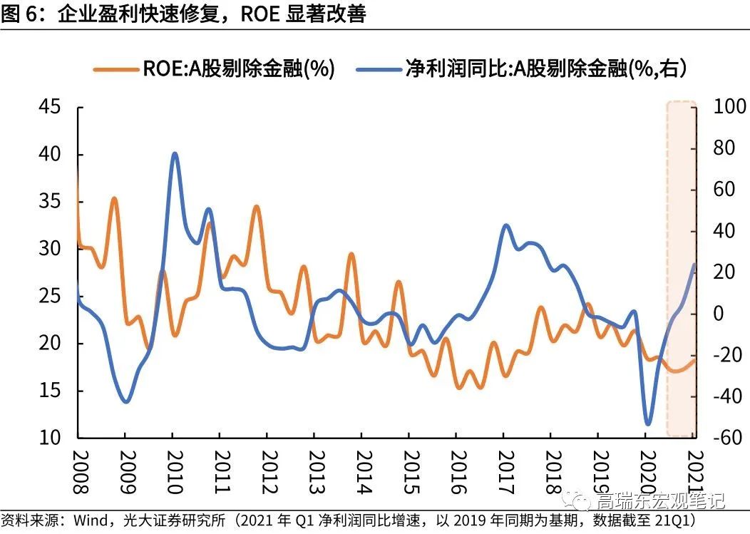 第一,投产能力:企业利润快速修复,ROE显著改善。2020年下半年,在国内经济强势复苏的进程下,企业经营状况改善,利润快速修复。2020年四季度,A股剔除金融后的净利润同比增速由负转正,ROE也触底反弹。2021年一季度,A股剔除金融后的净利润同比增长163%,相对于2019年同期增长24%,保持高速增长;ROE也由2020年四季度的17.3%上升到18.2%,盈利能力快速改善。企业利润的快速修复,为企业产能投资增加空间,企业有意愿也有能力进行产能投资决策。
