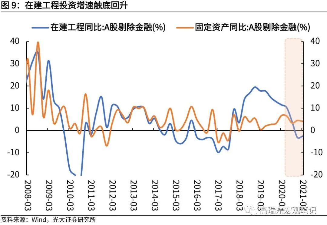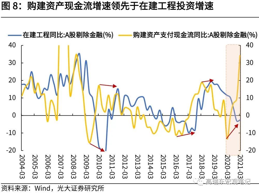 购建资产现金流增速领先于在建工程与固定资产投资增速。对于产能扩张周期来说,一般情况下的先后顺序为:资本支出>在建工程>固定资产(增速)。在产能周期开启初期,购建资产现金流增速率先触底回升;其次,从投资到投产存在滞后,购建资产的现金流增速往往领先于在建工程增速;最后,在建工程完工后才可以转为固定资产,因而从在建工程到固定资产也存在一定的滞后期。从历史走势来看,购建资产现金流增速一般领先于在建工程增速12个月左右。