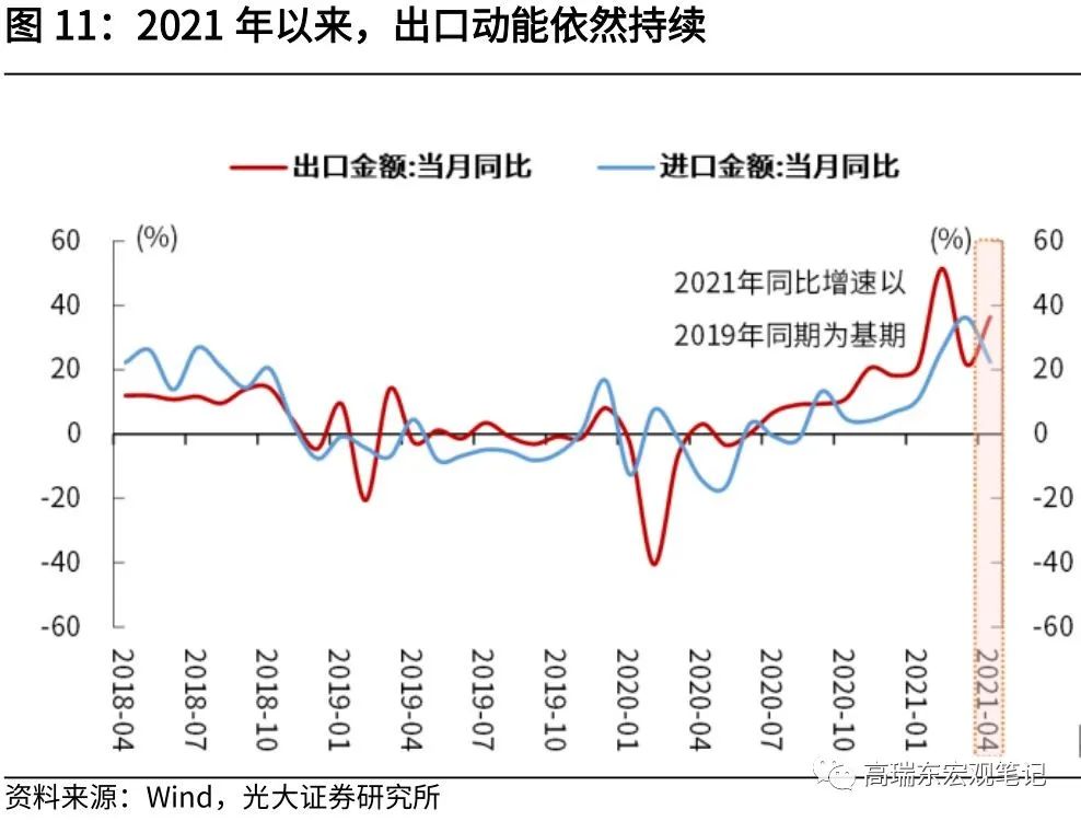 得益于出色疫情防控,出口链随后扩张,中国产能供应全球。得益于中国出色的疫情防控能力,中国防疫物资供应全球,弥补了全球产业链缺口,出口成为拉动中国经济增长的重要引擎。2020全年来看,净出口对中国GDP增速的贡献占比28%,达到了2001年以来的最高值。进入2021年,出口受到海外供需缺口与供应链复苏补库的支撑,动能依然强劲,2021年4月,出口(以美元计)同比增速32.3%,大超市场预期的22%,相比于2019年同期增长36%。