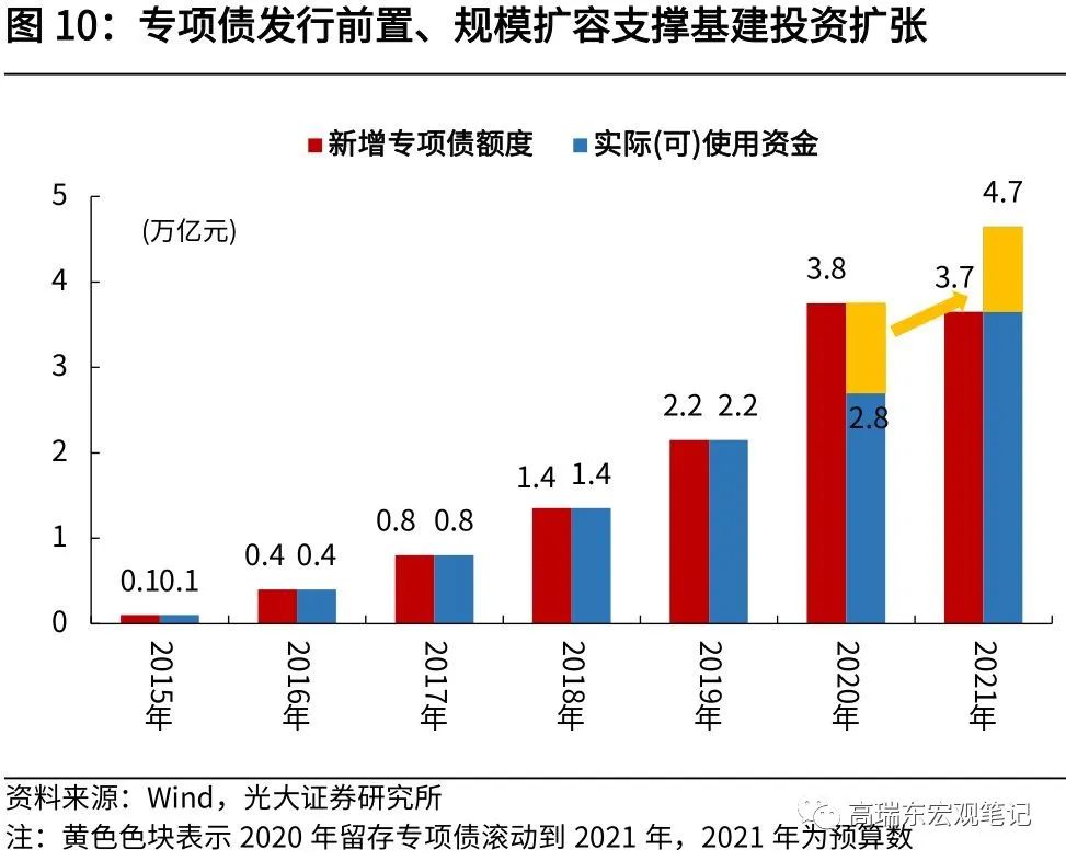 大规模财政刺激下,基建、地产先行扩张。基建与经济同步性较高,同时由具有很强的逆周期调节及稳定作用,常常用作逆周期调节工具,次贷危机期间,基建的逆周期调节作用显著,促使经济快速企稳。在新冠疫情冲击下,财政再次支持基建投资发力。2020年政府工作报告要求,要有效发挥地方政府债券作用,合理扩大专项债券使用范围。在发行前置、发行规模大幅增加的情况下,2020年中国专项债的发行对基建投资形成强有力的支撑,基建链产能投资先行扩张。