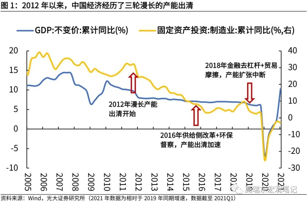 供给端来看,2012年以来,中国经济经历了三轮漫长的产能出清。第一轮发生在2012年到2016年,“四万亿”投资过后,中国经济增速换档,总需求低迷,过剩产能开始被淘汰。2016年供给侧改革叠加环保督察开启,产能出清加速;第二轮发生在2017年到2019年,“资管新规”去杠杆以及中美贸易摩擦,导致刚刚企稳的中国经济增速再度向下,初露苗头的产能周期未能延续;第三轮发生在2020年,新冠疫情蔓延,严重冲击了全球经济,国内投资出现负增长,产能利用率也降到历史低位,供给端出现过度出清。