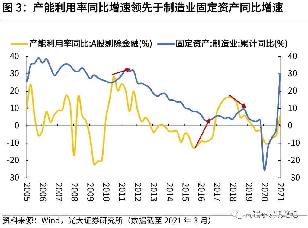 产能利用率是产能周期开启的领先指标。在经济复苏阶段,需求往往先行恢复,而供给则恢复较慢,在此情况下容易出现供需缺口,使得企业产能利用率持续处于高位,并带动企业盈利能力改善,这是企业作出产能投资决策的主要原因。从历史走势来看,产能利用率同比增速,往往领先于制造业固定资产投资同比增速,可以作为企业产能投资周期开启的重要信号。