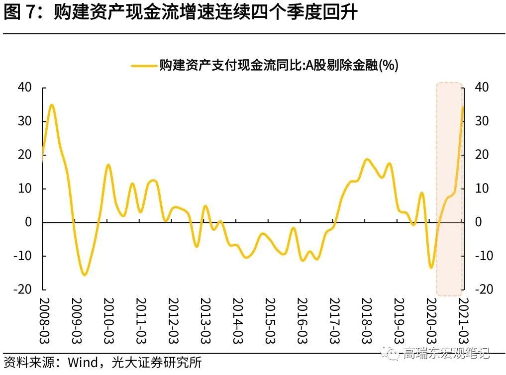 第二,投产行动:购建资产现金流增速连续四个季度回升。企业经营的改善带来了充足的经营现金流,为企业落实资本支出奠定了基础。现金流量表中,“为购建资产支付现金”在一定程度上反映了企业的资本支出意愿,可以追踪企业产能投资决策的开启。截至2021年一季度,A股剔除金融后的购建资产现金流同比增速为34.2%,相对于2019年同期增长16.4%,已经连续四个季度回升,企业资本开支意愿强烈。