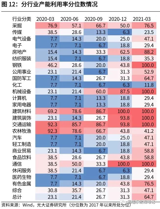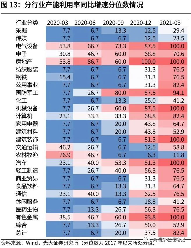 工业品涨价带动下,周期链产能扩张后来居上。从历史趋势来看,产能利用率变化与工业品价格变化趋势基本一致,在经济意义上,当企业产能利用率达到一定预期且对未来需求预期乐观的情况下,提高价格是自然而且合理的选择。在工业品涨价带动下,上游企业盈利持续高增,投资增速也持续回升。2021年1-3月,原材料行业利润增速比1—2月份提高88.4个百分点,拉动一季度规模以上工业利润增长51.5个百分点。从周期链产能利用率所处分位数来看,2021年一季度,有色金属、采掘等行业产能利用率处于历史高位,产能扩张后来居上。