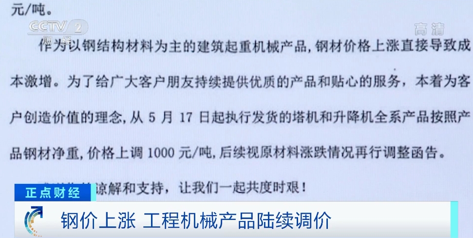 由于原材料涨价,近期工程机械主机厂开启了涨价模式。进入5月份以来,中联重科站类机械、起重机械,徐工塔式起重机、施工升降机、临工装载机先后发出涨价通知,背后原因是钢材等原材料价格的持续走高。