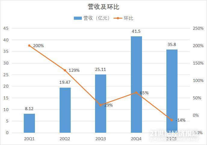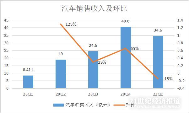 理想汽车自2019年底汽车量产,开始录得收入。根据公司招股书,该财年理想汽车实现2.84亿元营收,运营亏损18.58亿元,公司净亏损24.38亿元。理想汽车主要营收来自于汽车销售收入。2020年,随着理想汽车交付量的增加,汽车销售收入持续增加,理想汽车四季度营收额逐步攀升,首次实现单季净利润转正,成为国内首家实现单季盈利的造车新势力。而在2021年一季度,理想汽车营收为35.8亿元,较上季度相比下滑14%。