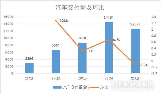 汽车交付量与公司收入密切相关。理想汽车是新势力中唯一一款以增程式电动车作为拳头产品,且是7座大型SUV的汽车公司。而上一款7座电动SUV,则是特斯拉的Model X,其售价高达70万元,因此理想ONE就成为了这一类车型的唯一选择。那么按照这个逻辑去推断,理想汽车的交付量应该是十分稳定才对,而财报显示,2021一季度,理想汽车交付量为12579辆,较于2020年同期的2896辆,同比增长334%;较于上季度的14464辆,环比下降13%。