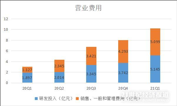 从影响公司净利润的另一个重要因素——营业费用来看,理想汽车的营业费用也在不断走高。根据财报,今年一季度理想汽车营业费用突破10亿元,环比增加28%。在研发方面,其投入5.145亿元,同比增长171%,环比增长37%,创连续五季度以来新高。