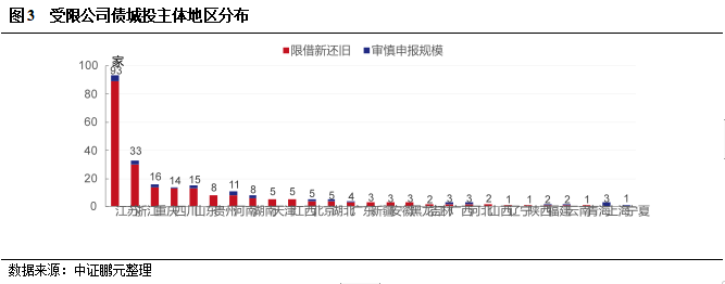 从城投平台地区来看,江苏、浙江、重庆、山东、四川等地受影响的平台数量高于其他地区,尤其江浙两地。以上五个省(直辖市)限借新还旧的平台数量分别为89家、30家、14家、13家、13家,此外还需审慎申报规模的平台数量分别为4家、3家、2家、2家和1家。仅江苏省内而言,南通(15家)、常州(12家)、泰州(11家)、苏州(9家)四地限借新还旧的平台数量较多,仅浙江省内而言,绍兴(8家)、湖州(7家)两地限借新还旧的平台数量较多,且均以区县级平台为主。