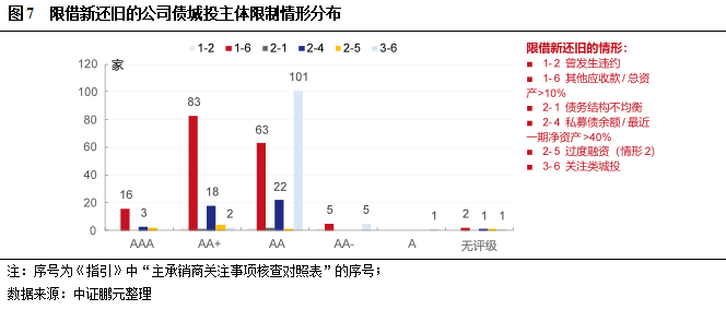根据《指引》列出的9项限借新还旧或优先借新还旧的情形,可获得相应指标共有6项情形。单从筛选指标看,非经营性应收占款超过10%达到271家,关注类城投110家、私募债余额占最近一期净资产超过40%[3]的主体65家,此外发生过违约风险(指公开债券及非标违约)主体58家。除限借新还旧主体外,需要审慎申报规模的主体则主要表现为债务短期化和债务结构大幅变化[4],分别为152家、90家,其他情形包括过度融资(第十八条情形一)21家、大额对外担保9家。