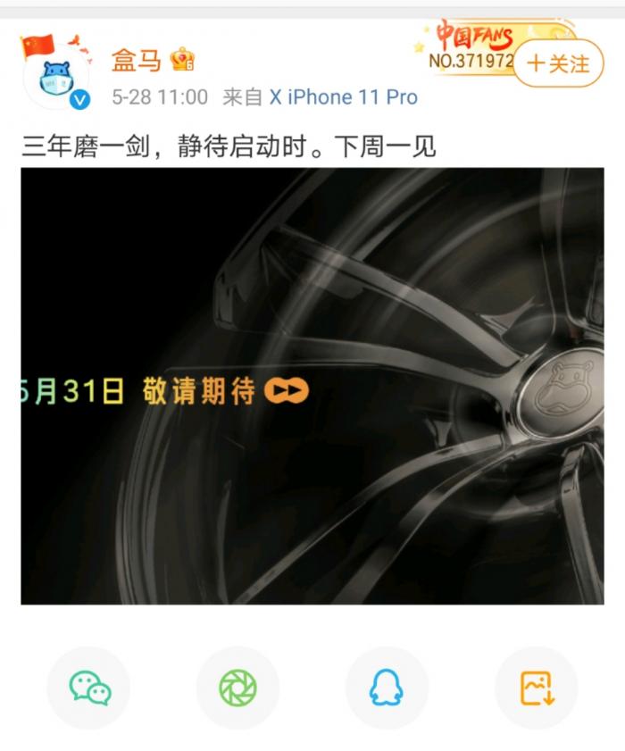5月28日,盒马官方微博发文“三年磨一剑,静待启动时。周一见”,并附带有车轮形象的海报。网友们纷纷表示:盒马也要造车了?
