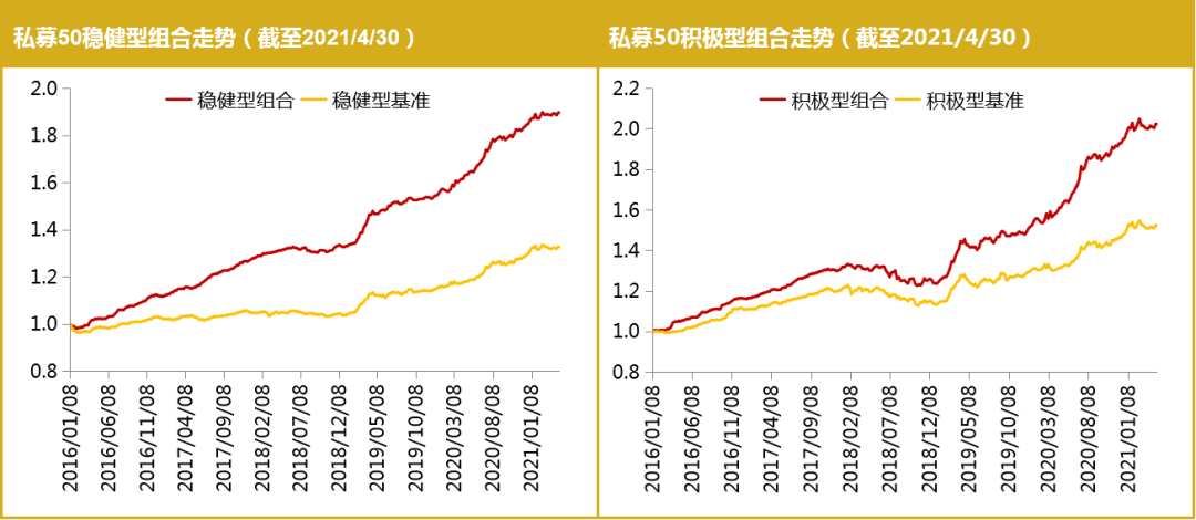 通过多元策略配置及管理人优选,稳健/积极型组合2020年收益20.54%/30.25%,长期年化收益12.97%/14.33%,最大回撤-1.92%/-7.96%,风险调整收益优秀。今年以来,在市场的剧烈波动中组合延续2.53%/2.95%正收益并跑赢基准,各策略组合皆取得正收益,体现出较好的前瞻性与市场适应性。