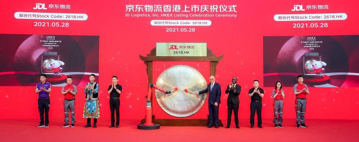 在上市仪式现场,来自京东物流客户及员工的9名代表与象征京东物流科技的六轴协作机械臂,共同敲响了京东物流香港上市的锣声。这9名代表分别是:长期信赖京东物流一体化供应链的客户代表,斯凯奇中国、东南亚、韩国首席执行官陈伟利;雀巢大中华区供应链及采购高级副总裁董明;在京东物流助力下、带领乡亲们致富的陕西省工信厅驻双井村第一书记张帆;陪伴京东物流成长的17年京东老用户张文辉;经历汶川地震、大学毕业返乡创业,希望通过京东物流让全国人吃上汶川樱桃的董新越先生;在北京安家置业、在京东“上大学”的京东物流14年老员工刘建;扎根“百岛之乡”、用一件件快递把偏远岛礁与世界相连的京东物流温州洞头营业部站长唐杨君;在一线快速成长的京东物流无人仓90后技术人才邹瑞;始终服务一线、获得过27次嘉奖的跨越速运优秀员工邹永获。