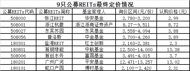 数据显示,张江REIT、浙江杭徽、东吴苏园、普洛斯、盐港REIT、首创水务、平安广河、首钢绿能这8只公募REITs最终网下有效报价认购倍数分别为8.85倍、4.86倍、3.61倍、5.85倍、8.47倍、8.35倍、4.56倍、11.13倍,而目前最火爆的要数蛇口产园,整体认购倍数为15.31倍(剔除无效报价后的所有网下投资者认购倍数)。