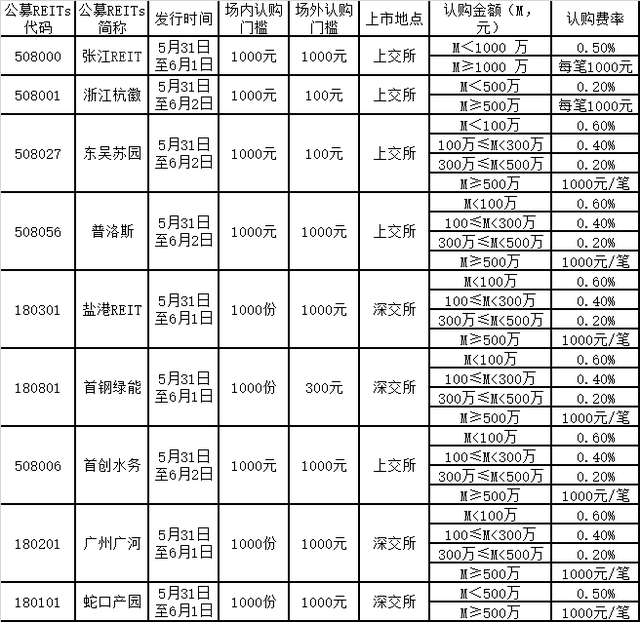 公众投资者可以通过场外直销及代销机构认购,也可以通过券商走场内认购方式,而从投资门槛上看,上交所的场内认购多数是1000元为最低认购门槛,深交所的场内认购是1000份为最低认购门槛,而每只公募REITs场外的最低认购门槛不太一样,有最低100元的,也有最低1000元的,投资者在参与认购时要看清楚相关规定。