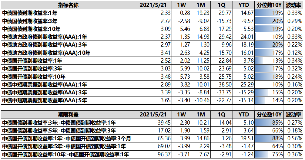 上周,利率债收益率下行明显。1年期国债收益率下行0.28BP至2.33%,10年期国债收益率下行5.46BP至3.09%。1年期国开债收益率下行2.02BP至2.52%,10年期国开债收益率下行5.73BP至3.48%。由于长短端收益率变动不一,国开债利率曲线斜率变平坦,国开债10年和1年期期限利差下行3.71BP至96.37BP,5年和1年期期限利差单周下行3.99BP至69.07BP,从历史10年估值分位数来看,10年和5年期分位数处在70分位数附近。上周,国常会再次提及防范大宗商品涨价风险,国内定价的商品价格出现明显回调,市场普遍担心通胀失控的情绪大幅缓解。同时,金融委定调保持流动性合理充裕,不搞急转弯,两大政策信号促使利率债收益率明显下行。展望后市,本轮利率债收益率下行是利多因素的一次集中释放,10年期国债收益率或已经触及震荡区间下限,收益率继续下行的空间已经十分有限。