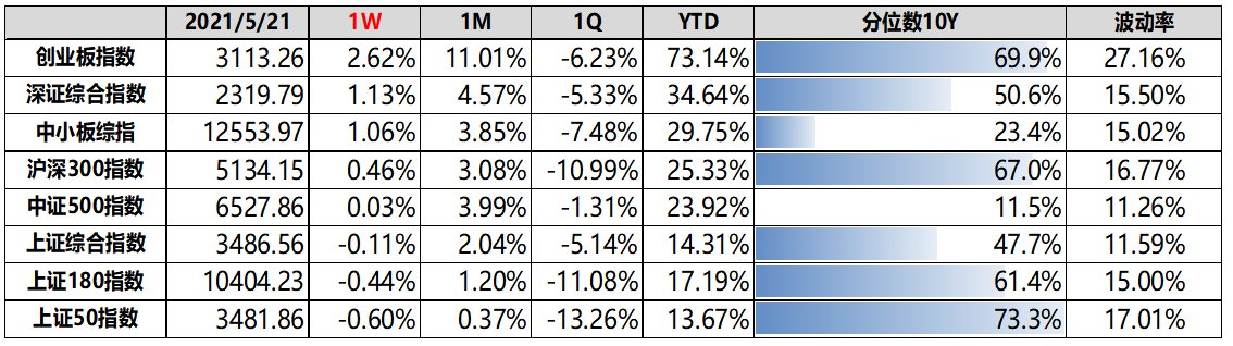 上周,宽基指数表现不一,创业板涨幅居前。上证综合指数收盘于3486.56点,下跌0.11%;创业板收盘于3113.26点,全周上涨2.62%;沪深300指数收盘于5134.15点,上涨0.46%。上周,国常会关注大宗商品涨价,通胀风险阶段性消除,股市最为担心的政策收紧风险预期阶段性反转。展望后市,倾向于维持股市未来结构性机会或大于整体机会的观点,延续区间震荡走势的概率较高,建议平衡配置风格。